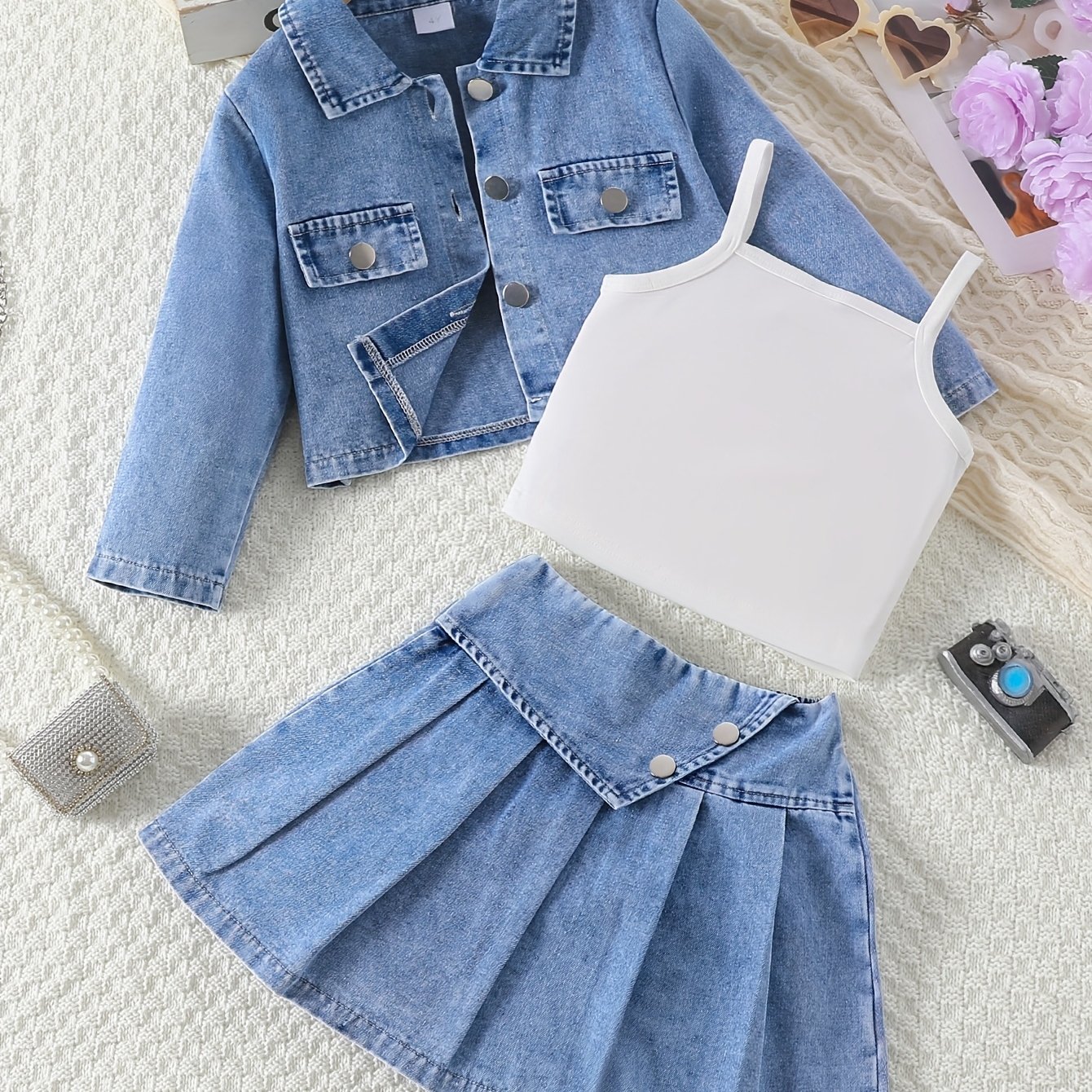 Soyez le premier à laisser votre avis sur “Ensemble 3 pièces fille : veste en jean, débardeur et jupe plissée. Idéal pour l’automne et l’hiver.”